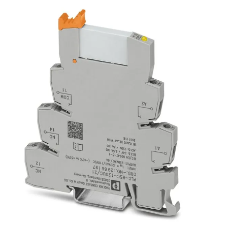Interfaz PLC, compuesta por borne de base PLC-BSC…/21 con conexión por tornillo y relé miniatura enchufable con contacto de potencia, para el montaje sobre carril NS 35/7,5, 1 contacto conmutado, tensión de entrada 120 V AC/110 V D